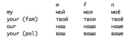 NOTES: ЕЁ (her) ИХ (their) МОЯ (my) ТВОЯ (your - familiar) ВАША (your - polite) НАША (our) ЕГО КНИГА (his book) ИХ КНИГИ (their books) Extra Words and Phrases: ЕГО (its) ЕГО (his) МОЙ СЫН (my son) НАША ДОЧЬ (our daughter) МОЁ ПИСЬМО (my letter) НАША ПИСЬМО (our letter) ![]() All the words on the quiz are in the feminine form. | ||